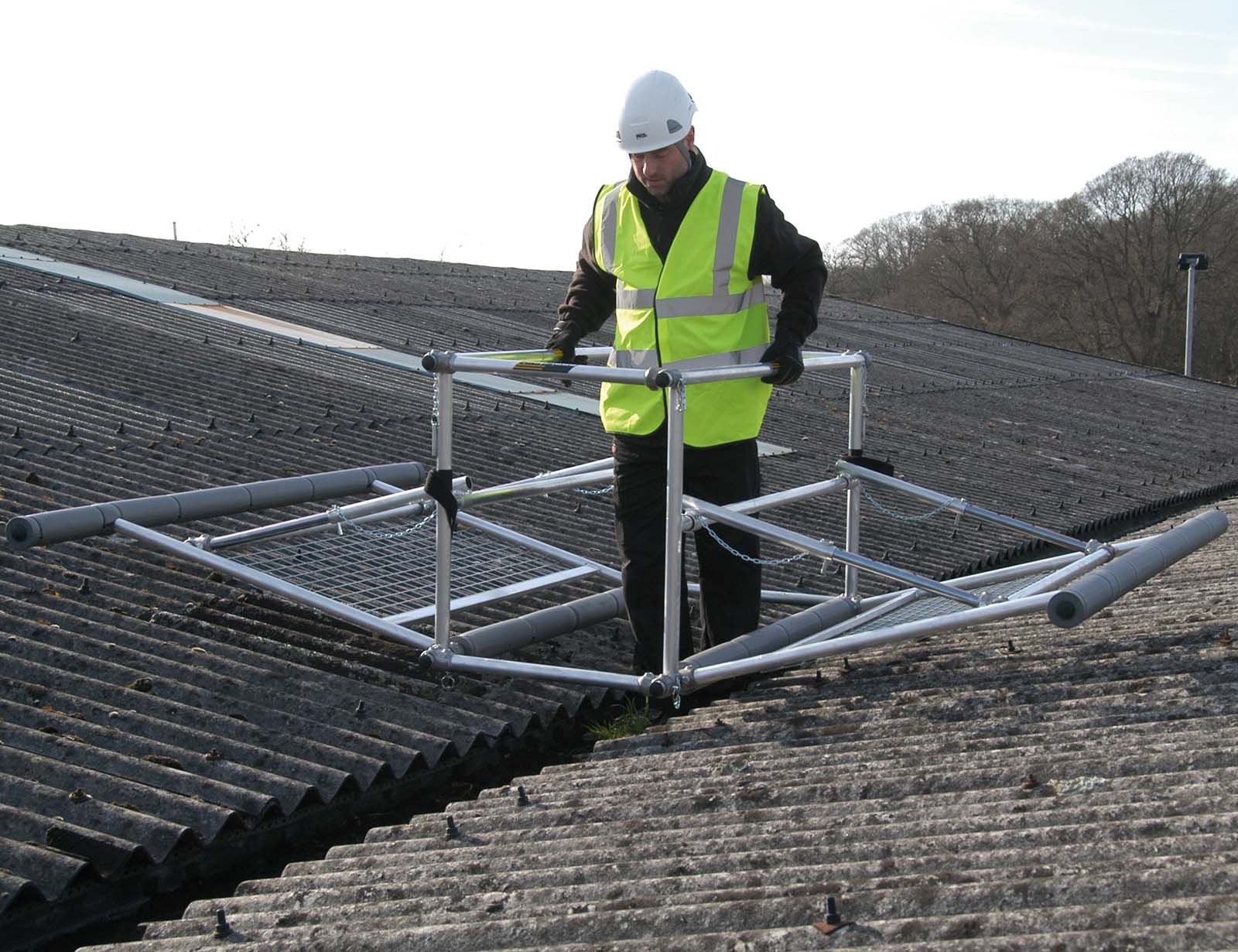 Roof-Walk is a fully guarded rolling work platform mounted on twin tracks to enable you to move up and down the roof. The standard length platform is 4.6m and runs up and down twin modular 4m linking track sections that are fitted with safety mesh and support battens.